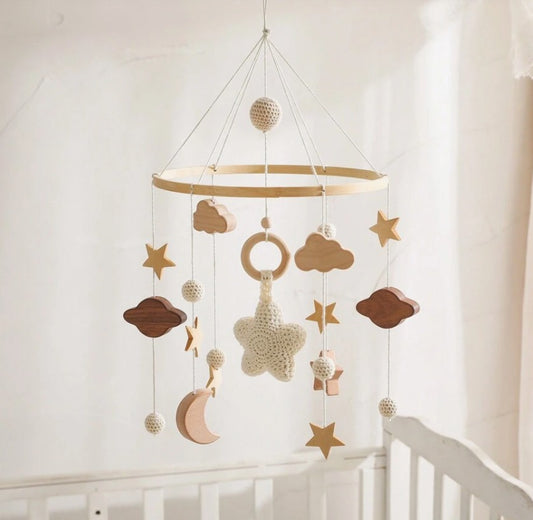 Une variété mobile musical bébé qui diffuse de douces berceuses aux modèles artisanaux en bois et laine, chaque pièce combine beauté et fonctionnalité.
